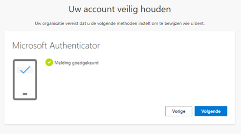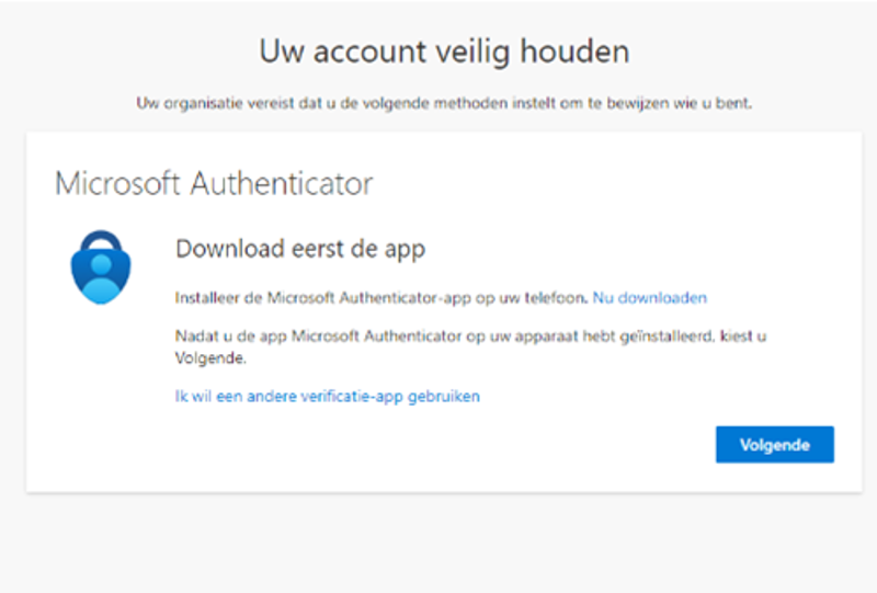 Indien je niet vooraf de Authenticator-app had ingesteld, zoals in scenario 1, dan kun je een geautomatiseerde melding krijgen om de Authenticator-app in te stellen. Deze melding komt pas na een bepaalde periode, waarbij we de datum in goed overleg met de organisatie afspreken.